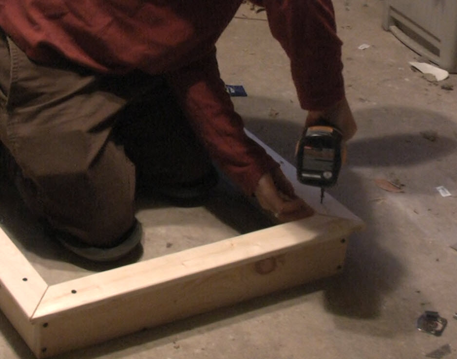 ATTACH THE EXTERIOR FRAME TO THE BOX-FRAME: The biggest thing to remember here is that the exterior frame is not very stable until it is screwed into the box-frame. So, knowing this I carefully lifted the exterior frame in one motion, flipped it over and placed it on top of the box frame. Starting at one of the 2-foot ends, I visually lined up the frame so that it was evenly placed on the box-frame. This is not too important because you can manipulate how it sits as you start to screw it down. I then took a screw (the same screws as the other step) and in one corner, carefully screwed through the top of the exterior frame into the edge of the box-frame.